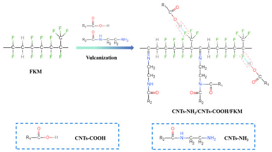 Mixing the pristine FKM with pre-blended ZnO and TAIC was performed using a mixer (KHB8, Guangdong Lina Industrial Co., Ltd., Dongguan, China) with a roll temperature of 50 °C. After the FKM was rolled and cut three times from each side of the mill, CNTs, CNTs-COOH, and CNTs-NH2 were fed into the mill. Trigonox® 101-50D was added in sequence and then rolled and cut 6 times on the open mill or until it became homogenized. After 24 h, re-milling was performed with a roll temperature of 30 °C. The rubber sheet was pressed with a flat vulcanizing machine (XH-406B, Xihua Testing Instrument Co., Ltd., Dongguan, China) at 177 °C under a pressure of 10 MPa for 7 min. Finally, the vulcanizate was post-cured at 230 °C for 2 h, and the as-prepared sheet was denoted as CNTs-NH2/CNTs-COOH/FKM composite. The reaction mechanism of CNTs-NH2/CNTs-COOH/FKM nanocomposites is shown in Figure 1.