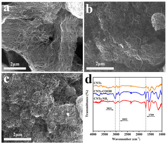 As shown in Figure 2d, the microstructure of the carbon nanotubes has been analyzed by FTIR spectra. The intense peaks at 1709 cm−1 for CNTs-COOH and CNTs-NH2 can be assigned to the stretching vibration of the C=O of -COOH groups on CNTs-COOH and the C=O of -CONH- groups on CNTs-NH2 [15,20]. The bands at 2852 cm−1 and 3031 cm−1 correspond to the C-H skeleton vibration [21].