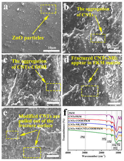 The SEM images of fractured surfaces of (a) FKM, (b) CNTs/FKM, (c) CNTs-COOH/FKM, (d) CNTs-NH2/FKM, and (e) CNTs-NH2/CNTs-COOH/FKM; (f) the FTIR spectra of different composites.