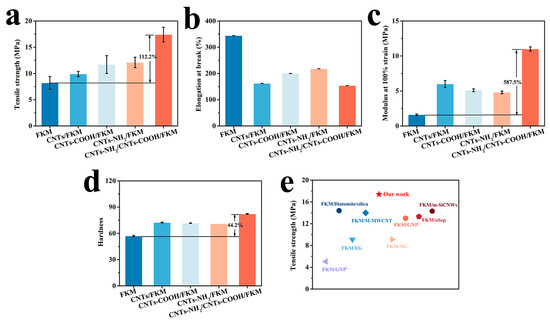Mechanical properties of nanocomposites: (a) tensile strength, (b) elongation at break, (c) modulus at 100% strain, (d) hardness. (e) Comparison of the tensile strength of our work with other literatures, including FKM/GNP1 [25], FKM/Diatomite/silica [26], FKM/EG [27], FKM/M-MWCNT [16], FKM/NG [28], FKM/GNP2 [29], FKM/oSep [30] and FKM/m-SiCNWs [2].
