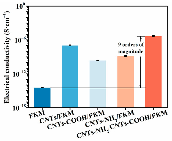 To research the effect of several carbon nanotubes on the electrical conductivity of the FKM composites, the electrical conductivity of different FKM nanocomposites was tested by a digital ultra-high resistance microcurrent-mearing instrument, and the results are shown in Figure 6. The conductivity of the pristine FKM was 3.7 × 10−15 S/cm. The addition of the linear carbon material formed a conductive network in the fluororubber matrix to improve its conductivity. However, the carbon nanotubes increased their own defects after their modification by the acid treatment, thus reducing their electrical conductivity. In addition, when treated with an amine modification, the conductivity of the carbon nanotubes decreased, but they were still able to adequately improve their conductivity compared with CNTs-COOH. Meanwhile, CNTs-NH2 was able to form a chemical bond with FKM using itself as the cross-linking center, which constituted an effective conductive network [15]. On this basis, the addition of CNTs-COOH completed the conductive network of FKM and improved the conductivity of the CNTs-NH2/CNTs-COOH/FKM composite by nine orders of magnitude compared with the pristine FKM. We find that this method of establishing a double-network model of crosslinking and conductive networks can stabilize the conductive network, which is consistent with the results reported in the literature [31].