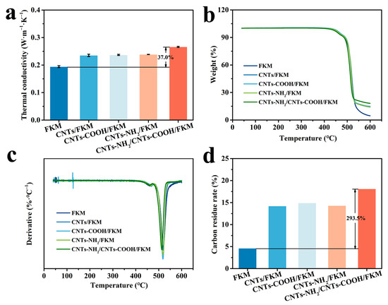 The thermal conductivity, TG, DTG, and carbon residue rate of the different composites are shown in Figure 7. From Figure 7a, it can be seen that the thermal conductivity networks formed by these three carbon nanotubes in the fluororubber matrix effectively enhanced the thermal conductivity of fluororubber. When CNTs-NH2 and CNTs-COOH were added simultaneously, the thermal conductivity of the CNTs-NH2/CNTs-COOH/FKM composite (0.2660 W·m−1K−1) was improved by 37.0% compared with the pristine fluororubber (0.1942 W·m−1K−1). This is attributed to the incorporation of highly thermal conductive carbon materials and their formation of a three-dimensional thermal conductive network within the fluororubber. This greatly improves the thermal conductivity pathway within the fluororubber, thus enhancing the fluororubber’s thermal conductivity.