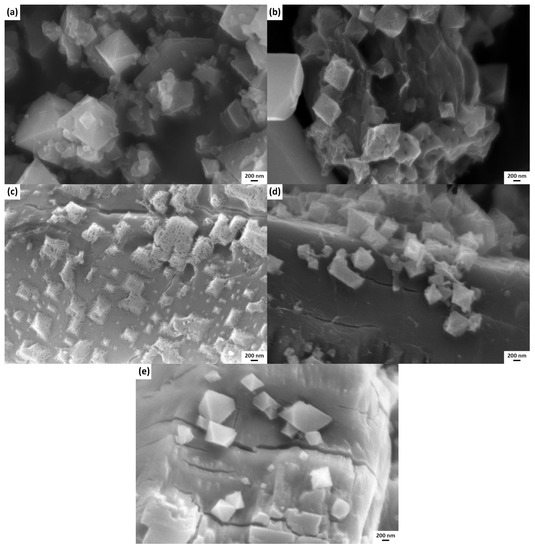 SEM images of (a) HKUST-1 and CNCs@HKUST-1 composites with the addition of CNCs of (b) 2.5%, (c) 5%, (d) 7.5%, and (e) 10%.