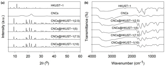 (a) XRD diffractogram and (b) FTIR spectra of CNCs, HKUST-1, and CNCs@HKUST-1 composites.
