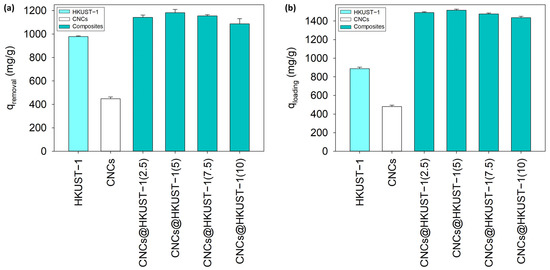 Figure 3a shows the adsorption capacity of CNCs, HKUST-1, and CNCs@HKUST-1 composites at the CNCs addition of 2.5, 5, 7.5, and 10%. In single materials, CNCs have a CV adsorption capacity of up to 448.33 ± 14.55 mg/g which is lower than the adsorption capacity of HKUST-1 (977.99 ± 6.51 mg/g). In the CNCs@HKUST-1 composites, the CNCs addition of 2.5, 5, 7.5, and 10% into the composite frameworks caused an increase in the adsorption capacity of CV up to 16.69, 20.89, 18.08, and 11.15% compared to HKUST-1. Here, it proves that the well−integrated morphology of CNCs@HKUST-1(5) gave the higher ability of CV removal. CNCs@HKUST-1(5) had the ability to adsorb CV compound up to 1182.25 ± 27.74 mg/g, indicating the CNCs addition of 5% as the optimum condition to provide the best CNCs@HKUST-1 composite. As shown in Table 1, the adsorption capacity of CNCs@HKUST-1 composites were higher than other composites consisting of cellulose−based materials and MOFs. Although adsorption is affected by various parameters, these results demonstrate the great potential of utilizing CNCs@HKUST-1 composites in wastewater treatment.