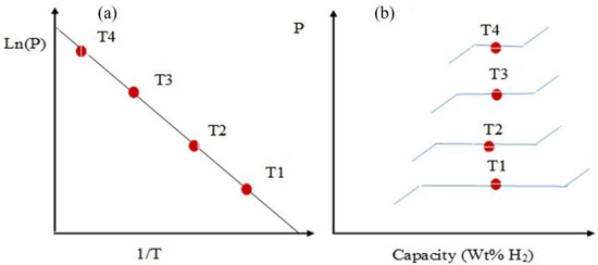 Practical materials for HS should have the ability to undergo a reversible hydrogenation/dehydrogenation process, which is determined by the binding energy of hydrogen atoms. The PCT curve is a graph representing the dependence of pressure on composition at different temperatures. Figure 1 demonstrates a graphical interpretation of the Van ’t Hoff equation [26], which indicates the dependence of the logarithm of the equilibrium desorption pressure on the reciprocal temperature (T) (Figure 1a), as well as the dependence of the amount of hydrogen accumulation on pressure (Figure 1b).
