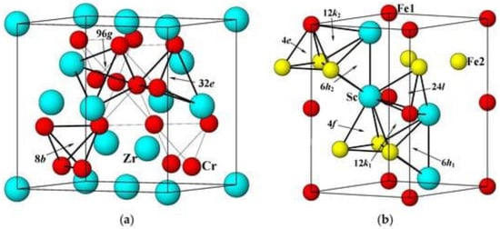 Intermetallic compounds can be used as hydrogen accumulators [37,38]. This is due to the peculiarities of their atomic structure, in which interstices with the optimal binding energy for hydrogen are observed, forming the process of absorption or desorption under conditions close to standard. In this regard, for the storage of hydrogen, the class of compounds of the Laves phase with the formula unit (AB) needs to be taken into consideration [39]. Because they change from one to the other on heating and cooling (usually C14 at high temperatures and C15 at low temperatures), hydrogen absorption–desorption can be thought of as a phase change process. Structure C15 is an fcc structure containing six atoms per unit cell, while structures C14 and C36 are hexagonal structures containing 12 and 24 atoms per unit cell. Figure 3 demonstrates the crystal structures of C14- and C15-type alloys. Ideally, the lattice parameters are closely related in each structure and between structures. However, in real MH alloys with a predominance of C14, the c/a ratio is slightly lower than the theoretical value (223--√≅1633) [40]. Three types of position are available for tetrahedral hydrogen filling positions (A2B2, AB3 and B4) for both C14 and C15 structures, as shown in Figure 3. There are no octahedral positions at all in the Laves phases, so further discussion will focus only on tetrahedral positions [41].