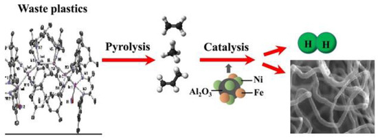 In [59], pyrolysis and catalytic decomposition of polypropylene were carried out in the technological process for the production of hydrogen and carbon nanomaterials. A series of new Fe/Ni catalysts was prepared, and the effect of the active metal component of the catalyst (Fe, Ni, FeNi) and the synthesis method (sol–gel and impregnation) was studied. The results showed that the production of hydrogen and solid matter occurred in descending order with loading of Fe-Ni, Fe and Ni, while the catalysts prepared by sol–gel were more catalytic than their impregnated counterparts. FeNi (SG) demonstrated optimal activity in the production of 25.14 mmol/g of hydrogen plastic and 360 mg/g of high-quality plastic made of carbon nanomaterials.