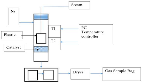 For the catalytic pyrolysis of plastic waste, a two-stage fixed-bed reactor (with pyrolysis zone, height 310 mm; bottom: pyrolysis zone, height 310 mm) was reported (Figure 5 [60]). Three series of experiments were conducted to determine the technological parameters for the generation of hydrogen and CNTs: with the use of Fe/γ-Al2O3, Fe/α-Al2O3, Ni/γ-Al2O3, Ni/α-Al2O3, and Ni-Fe/γ-Al2O3 catalysts; with ratios of mass of steam to mass of plastic of 0, 0.3, 1, and 2.6; and with catalytic temperatures of 700, 800, and 900 °C.
