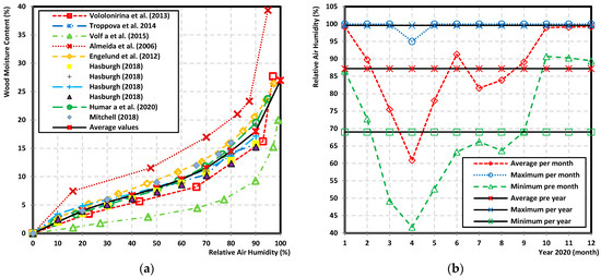 Wood moisture content and relative air humidity. (a) Wood moisture content in dependence on relative air humidity. (b) Relative air humidity in Slovakia in 2020.