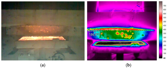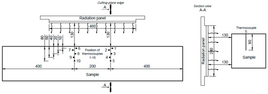 A Fluke RSE600 thermal (infrared) imaging camera (Fluke Corporation, Everett, WA, USA) with temperature measurement range −10 to +1200 °C was used to measure the temperature on the entire visible surface of the sample and on the radiation panel (Figure 4). The thermal imaging camera was placed on a tripod above the sample at height of 2 m. The temperature courses recorded by the thermal imaging camera (values for each pixel of the image inn interval of 0.1 s) were used to detect the temperature of the radiation panel to be entered in simulation as well as for the FEM validation.