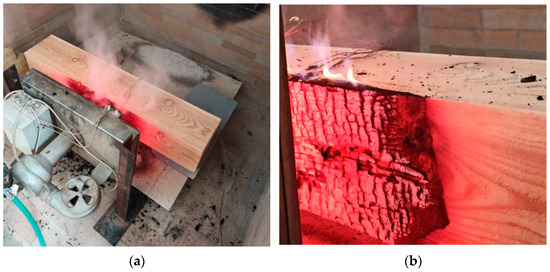 The size of the radiation panel heating area was 480 × 280 mm2, the emitted energy was produced by the burning propane–butane gas with a constant flow of 15 m3∙h−1. The test equipment used is shown in Figure 3a. The samples were placed at 130 mm far from the radiation panel. The distance of 130 mm represents the minimum distance of the sample from the radiation panel, when expected that the laminar flames will appear (Figure 3b). At the end of each test, all the samples were cooled. Slices with a width of 10 mm were cut from the centre of the test samples to determine the charred layer area.