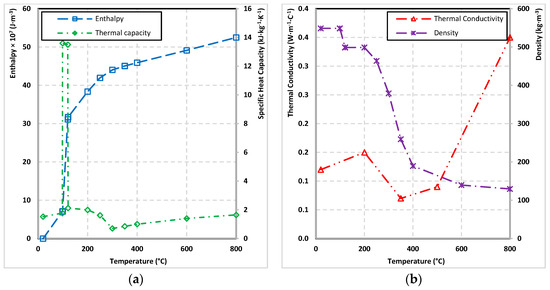 The properties of European larch: (a) enthalpy and specific heat capacity, and (b) thermal conductivity and density.