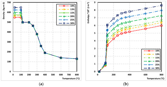 For investigating the effect of moisture content of wood on the wood charred layer parameters, the ANSYS software and validated FEM were used. A total of 6 transient thermal analysis of heat transfer in wood thermally loaded were provided. They were used to determine the area of the charred layer (temperature reached minimum 300 °C during the fire test) and the area of wood degradation, i.e., pyrolysis zone, (temperature was in the range of 100–300 °C during the fire test). In each analysis, the moisture content of the wood varied (10, 13, 15, 20, 25, 30%). The wood moisture content parameter was implemented in the ANSYS simulation by changing the wood density and enthalpy corresponding with applied wood moisture content (Figure 6). The initial density of the wood at the specified moisture content was as follows: 10%–548.8 kg·m−3, 13%–563.8 kg·m−3, 15%–573.7 kg·m−3, 20%–598.7 kg·m−3, 25%–623.6 kg·m−3, and 30%–648.6 kg·m−3.