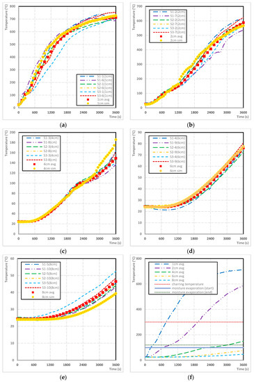 A comparison of temperature profiles—real test and simulation: (a) 1 cm depth, (b) 2 cm depth, (c) 4 cm depth, (d) 6 cm depth, (e) 8 cm depth, and (f) comparison of average temperature profiles.
