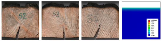 The results of the modeling and simulation of thermal loading of larch wooden beams with dimensions as specified in Section 2.1 and different densities are as follows. For wooden beams with a moisture content of 10%, the area of the charred layer was of 5846 mm2 and the area of degraded wood was 3172 mm2. At a moisture content of 13%, the area of the charred layer was 5629 mm2 and the area of degraded wood was 2997 mm2. At a moisture content of 15%, the area of the charred layer was of 5472 mm2 and the area of degraded wood was of 2935 mm2. At a moisture content of 20%, the area of the charred layer was of 5329 mm2 and the area of degraded wood was 2789 mm2. At a moisture content of 25%, the area of the charred layer was 5094 mm2 and the area of degraded wood was of 2670 mm2. At a moisture content of 30%, the area of the charred layer was 4715 mm2 and the area of degraded wood was of 2295 mm2.