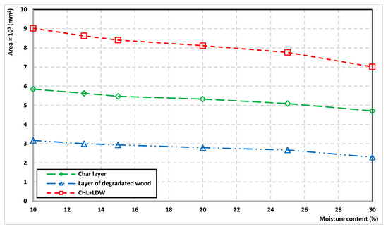 It is clear from the results that the area of the charred layer of wood and degraded wood decreases exponentially with increasing moisture content (Figure 9). The shape of the charred layer and the layer of degraded wood are the same even when changing moisture content.