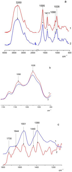 FTIR spectra of the studied films. (a): (1) sodium alginate (ALG) and (2) ALG-ceria nanoparticles (CeONPs); (b): fragment of spectra 1a on enlarged scale, ALG (1) and ALG(CeONP) (2); (c): citrate-stabilized CeO2 (1) and difference spectrum obtained by subtracting the spectrum of ALG from that of the ALG(CeONP) composite (2).