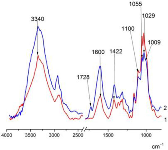 FTIR spectra: (1) BC–ALG–chitosan (CS_), (2) BC–ALG(CeONP)–CS.