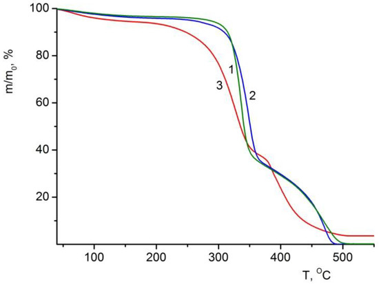 TGA curves of (1) BC, (2) BC–ALG–CS, and (3) BC–ALG(CeONP)–CS films.