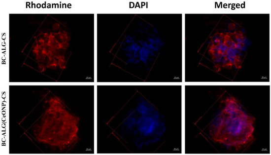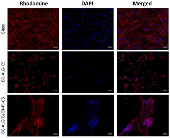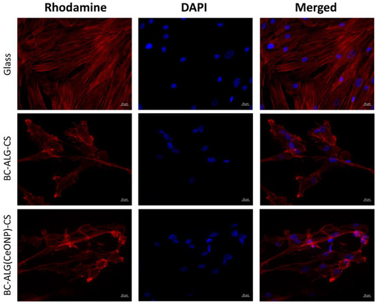 The BC-ALG(CeONP)-CS composite film was shown to have better biocompatibility as compared to BC-ALG-CS. This effect can be caused by the complex action of different factors for different reasons. In analyzing these reasons, one should take into account not only the biological activity of the CeONPs, but also the possible action of the nanosized filler upon the physical properties of the matrix material. It is well known that the adhesion of cells to the scaffold surface is strongly affected by the micro-relief and texture of the latter [58]. The introduction of CeONPs into the polysaccharide matrix is supposed to create a surface structure that is most suitable for the formation of contacts of the cell with the scaffold (see Figure 3f). A certain electric charge on the scaffold surface also ensures optimal conditions for proliferation [3]. In the case of the nanocomposite material formed in our work, this additional electric charge might be provided by the nanoparticles [59].