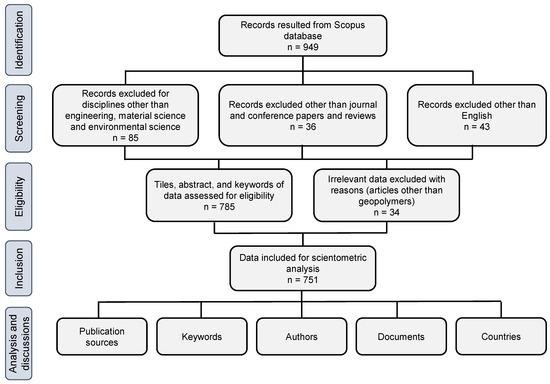 This work identified the different facets of the literature using a scientometric assessment of bibliometric data. In scientometric studies, systematic visualization, a technique developed by experts for analyzing bibliographic records, is applied [49,50]. Data retrieval was done using the Preferred Reporting Items for Systematic Reviews and Meta-Analyses (PRISMA) approach. The PRISMA checklist is attached as Table S1 in supplementary materials. Since there are extensive articles published on the topic under investigation, it was vital to use a trustworthy database. For this reason, the very dependable databases Scopus and Web of Science were appropriate [51,52]. The Scopus database, which academics strongly suggest [53,54], was used to compile bibliometric data on FRGP research. As of June 2022, 949 results for the term “fiber-reinforced geopolymers” were returned by a Scopus search. There were several filter settings used to reduce unnecessary papers. The whole PRISMA technique for data extraction, assessment, and the various restrictions and filters is shown in Figure 1. A similar strategy was used in some earlier investigations across other subject areas [55,56,57]. Finally, 751 records were used for further analysis using the appropriate tools. The literature data were compiled in Comma Separated Values (CSV) format, and VOSviewer software, version 1.6.18, was used to create the scientific representation and quantitative valuation of the information acquired. VOSviewer is an open-source visualization tool and freely accessible [58,59,60]. Therefore, by using VOSviewer, the intentions of the current study were achieved. The generated data (CSV files) were imported to the VOSviewer to allow for analysis. The systematic research looked at the publication outlets, the highly popular keywords, the highly referenced authors and publications, and countries’ participation. Tables were created to provide quantitative data, while graphs were given to show the different traits, their interactions, and co-occurrence.