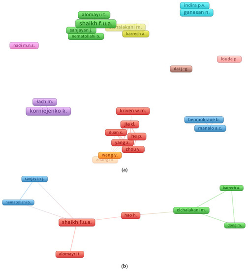 Citations serve as evidence of a scholar’s importance in a specific area of research [63]. The minimal publication requirement for a scientist was set at 10, and 27 of the 1583 writers reached this constraint. According to bibliometric data, Table 3 lists the authors of FRGP research with the most publications and citations. By dividing the overall citations by the publications, the average number of citations for a writer was calculated. When all factors, including the quantity of papers, the average citations, and the overall citations, were taken into account, it was difficult to assess a researcher’s success. Instead, each element’s evaluation for the scientist was evaluated separately. Shaikh F.U.A. was found to be the most productive scholar, based on the data analysis, with 26 papers, followed by Korniejenko K., with 25, and Ganesan N., with 18 publications. In the research of FRGP, Shaikh F.U.A. was first in the research area based on total citations with 1486, Alomayri T. was second with 714, and Jia D. was third with 638 total citations. However, Nematollahi B. may be placed at the top with about 62 average citations, Sanjayan J. may be in second place with about 58, and Shaikh F.U.A. may be in third place with approximately 57 average citations. The association between the most well-known writers and authors with at least 10 publications is seen in Figure 7. Figure 7a displays the scientific visualization of the researcher’s co-authorship with at least 10 published articles in the investigation of FRGP. Additionally, Figure 7b shows the greatest number of citation-based related authors. A few FRGP scholars were connected by citations, as it was discovered that 8 of the 27 authors made up the largest group of connected authors based on citations.