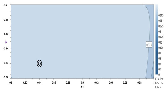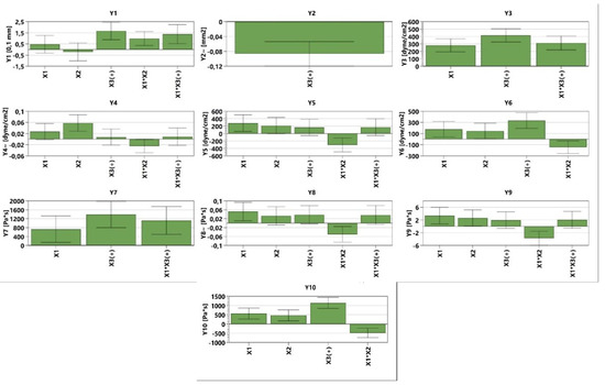 The tangential stress at the first level is influenced positively by X1, X3, and the interaction between X1×X3, increasing the values of the tangential stress. In the case of Y4 (Figure 3, Table S1 and Equation (S4)), it can be noticed that X1, X2, X3, and the interaction X1×X3 produce higher tangential stress. In the case of the latter, the influence is lower compared with the first three parameters. The interaction between X1×X2 conducts to lower tangential stress. The interaction between X1×X2 shows the same behavior in the case of Y5 (Figure 3, Table S1 and Equation (S5)) and Y6 (Figure 3, Table S1 and Equation (S6)) (decreases tangential stress). The dependent parameters X1, X2, and X3 conduct to an increased value regarding the tangential stress, whilst in the case of Y5, the interaction of X1×X3 exhibits the same behavior. The viscosity at different levels is influenced by the following dependent parameters: X1, X3, and X1×X3, all three of them increasing the viscosity for the independent parameters Y7–Y9 (Figure 3, Table S1, Equations (S7)–(S9)). The Y8–Y10 (Figure 3, Table S1 and Equations (S8)–(S10)) parameters are also influenced by the X2 (increased viscosity) and the interaction between X1×X2 that decreases the viscosity. It can be noticed that the interaction between X1×X2 decreases both the tangential stress and the viscosity while destructuring the gel at level 11 and while the system is reorganizing at both level 11 and level 1 (Figure 3).