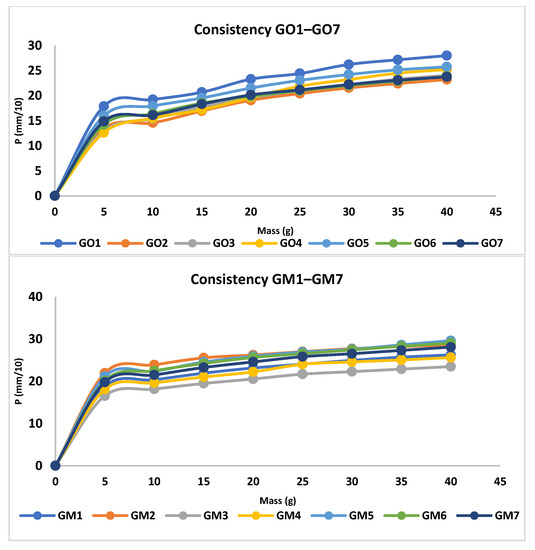 The analysis of the consistency of the gels shows that gels containing MIC have been more easily infiltrated compared with the blank series of gels. The consistency increases directly proportional to the weight applied. In addition, according to the design used, the factors that are significantly influencing the consistency are X3 and the interaction between X1×X2 and X1×X3; all of them conducting in an increased penetration (Figure 3, Table S1, and Equation (S1)). X1 and X2 are influencing the consistency differently; X1 increases the penetration capability, whilst X2 decreases the penetration. The last two factors have a reduced influence on consistency compared with X3 and the interaction between X1×X2 and X1×X3. The gel with the highest penetration capacity is GM5 (29 mm), whilst the lowest penetration capacity is registered in the case of GO2 (23.2 mm) (Figure 4 and Table 4).