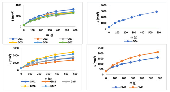 The values of spreadability demonstrate that the blank series of gels (GO1–GO7) are more easily spreadable than GM1–GM7, while applying the same weight. By increasing the weight, the evaluated gels spread progressively; a behavior mentioned also by Muț et al., where fluconazole hydrogels were developed and evaluated [47]. The spreadability profiles can be retrieved in Figure 5 and the final values obtained during the experiment can be observed in Table 4. The highest spreadability value is 32,525.43 mm2 (GO1), while the lowest is 1384.74 mm2 (GM2). Studies have shown that the concentration of the gelling agent is inversely proportional to the spreadability capacity [48]. The main parameter that affects this parameter is the presence of MIC (X3) (Figure 3, Table S1 and Equation (S2)), which conducts to a decreased value regarding the spreadability.