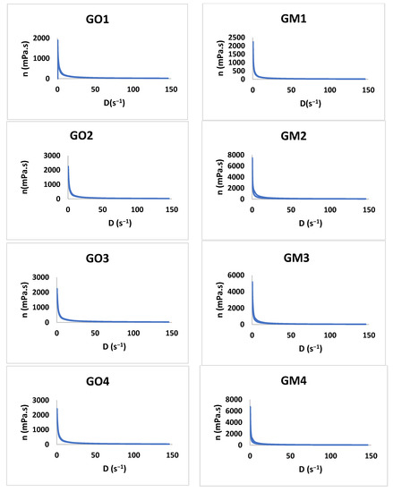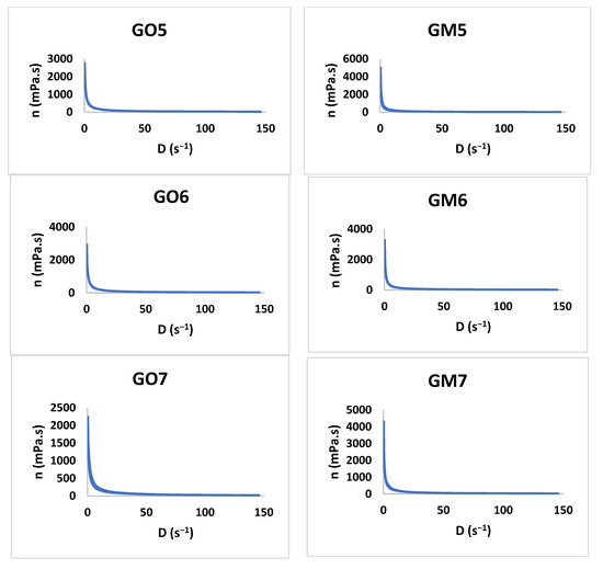 The viscosity profiles for GO1-GO7 and GM1 and GM7.