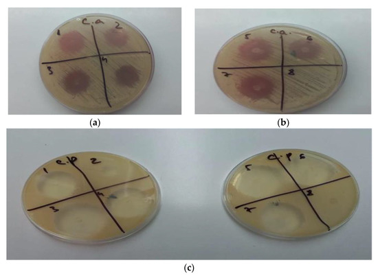 (a) GM1–GM4 (1–4) inhibition of Candida albicans; (b) GM5–GM7 (5–7), GO5 (8) inhibition of Candida albicans; (c) GM1–GM7 (1–7), GO5 (8) inhibition of Candida parapsilosis.
