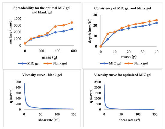 The spreadability, consistency, and viscosity curves were traced; all three are included in Figure 8. The MIC gel and the blank gel presented comparable behavior regarding spreadability and consistency. Additionally, through this experiment, the influence of the presence/absence of MIC is highlighted, with the MIC decreasing both spreadability and consistency. Regarding the viscosity, MIC presence tends to increase the viscosity behavior revealed in Figure 8.