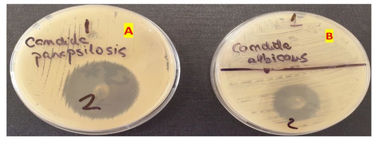 The inhibition of Candida parapsilosis (A) and Candida albicans (B) using the blank gel (1) and the optimized MIC gel (2).