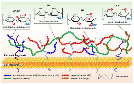 Most GAGs usually do not exist alone in vivo. In addition to HA, GAGs are linked to core proteins to form N-linked/O-linked proteoglycans (PGs) []. For example, HS and CS/DS chains are linked to the serine of core proteins via a tetrasaccharide unit of GlcA (1→3) β-Gal (1→3) β-Gal (1→4) β-Xyl (1→4). In fact, they are products of posttranslational modifications (glycosylation) of proteins. PGs are widely present on the cell surface, extracellular matrix (ECM), and basement membrane (BMs) (Figure 1). They participate in various life activities. GAGs/PGs are considered to be the most complex and informative biomolecules in organisms due to the differences in glycosidic bond types, polymerization, sulfation patterns, monosaccharide types, and core proteins []. Therefore, GAGs/PGs are indispensable for exerting the normal physiological functions of cells. They not only act as traditional supporting structures, but also interact with many extracellular signaling molecules, binding proteins, and enzymes to participate in different biological processes [,,,].