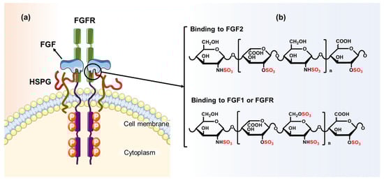 Schematic diagram of the ternary complex of FGF/HS/FGFR and the key sites for HS binding. (a) FGFR comprises extracellular Ig-like domains, intracellular tyrosine kinase domains, and transmembrane domain. Ig-like domains bind FGF with the assistance of HS to form ternary complex; (b) HS binding to FGF2 requires 2-O-S of IdoA and N-S of GlcN; HS binding to FGF1 and FGFR requires 2-O-S of IdoA and 6-O-S, N-S of GlcN; the N-S of the nonreducing terminal residue is also necessary for HS binding to FGF/FGFR. The increased expression of HS in most tumor cells enhances FGF/FGFR signal transduction, which is beneficial to tumor cell growth and angiogenesis. (The data of the HS sequence is cited from reference [,,,]).