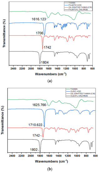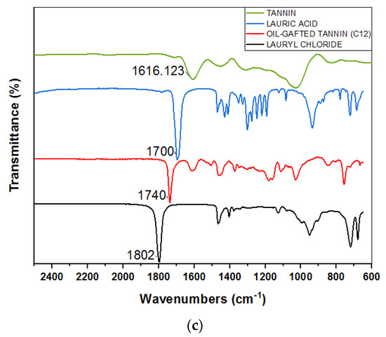 Figure 1a shows the FTIR spectra of mimosa tannin, palmitic acid, palmitoyl chloride, and oil-grafted tannin using palmitoyl chloride. In the FTIR spectra of the oil-grafted tannin, a sharp peak appeared at 1742 cm−1, proving the presence of ester groups in the oil-grafted tannin. The spectrum for palmitoyl chloride shows that a sharp peak at 1804 cm−1 is due to the presence of the C=O stretch band for acid chlorides [40]. This sharp peak disappears when using palmitoyl chloride to synthesize oil-grafted mimosa tannin. The absorption band at 1616.12 cm−1 in the tannin spectrum is attributed to the C–H vibration in the aromatic ring of the mimosa tannin [41,42]. A sharp peak appearing at 1706 cm−1 in the palmitic acid spectrum is assigned to the C=O stretch band for the carboxylic acid group [40]. Figure 1b shows the FTIR spectra of mimosa tannin, palmitic acid, palmitoyl chloride, and oil-grafted tannin using palmitoyl chloride [40,41,42,43,44]. Figure 1c shows the FTIR spectra of mimosa tannin, lauric acid, lauroyl chloride, and oil-grafted tannin using lauroyl chloride [40,41,42,43,44]. It can be concluded that different fatty acid chloride chains did not influence the FTIR result but that they affected the yield of oil-grafted tannin, as shown in Table 2.