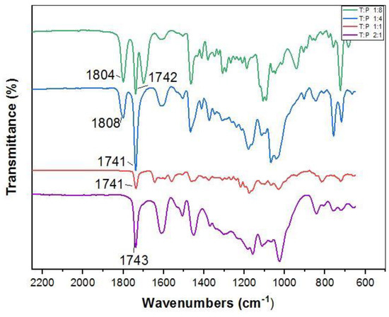 Oil-grafted tannins using different mass ratios of fatty acid chlorides and tannin were also prepared. As different fatty acid chloride chains did not influence the FTIR result, only palmitoyl chloride was consequently maintained for further investigation. Table 3 shows different compositions used to synthesize the oil-grafted tannin by using palmitoyl chloride [40,44]. Based on Figure 2, an absorption band appears at 1804 cm−1 and 1808 cm−1 in the spectra of the oil-grafted tannins using palmitoyl chloride with mass ratios of 1:8 and 1:4, respectively. This peak is due to the presence of an excess of the acid chloride group of palmitoyl chloride in the oil-grafted tannin [40]. Contradictorily, the spectra for mass ratios of 1:1 and 2:1 show that there was no presence of peaks from the acid chloride group but only an ester group existed. Therefore, the 1:1 mass ratio was used to prepare the oil-grafted tannin.