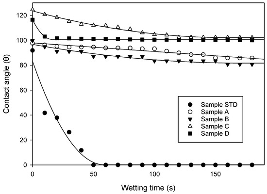 where , and are regarded as the SFE of a solid, the SFE of the solid–liquid interface, and the SFE of the liquid, respectively, and θ is the value of the contact angle between the solid and the measuring liquid. However, the value of γs and γsl cannot be obtained directly from Young’s equation and using another equation by Dupré is needed [36]. Dupré introduced the concept of work adhesion between phase a and phase b by the following equation: