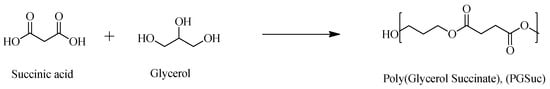 Succinic acid is a four-carbon dicarboxylic acid with the chemical formula HOOC(CH2)2COOH, and belongs to the category of aliphatic acids. It is a white, odorless solid and is an important bio-based monomer. According to the US Food and Drug Administration (FDA), succinic acid and glycerol can be considered safe materials and have been approved for medical applications. Both these natural compounds are plenteous and their major advantage is their cost-effective production [11,12]. Agach et al. [13] reported petrochemical-free one-step synthesis of poly(glycerol succinate) (PGxS) oligoesters, where x represents the glycerol-to-succinic acid (Gly/Suc) molar ratio, carried out without use of a solvent or catalyst. Carnahan et al. reported the synthesis of PGSuc dendrimers using benzilidene acetal as a protecting group, which can be selectively removed under mild conditions. All dendrimers were found to be amorphous and their glass transition temperatures (Tg) increased from −20 to 14 °C as the molecular weight increased [14]. In a recent work of Valerio et al., the synthesis of PGSuc polyesters using glycerol of different purities and sources was described in order to evaluate the effect of glycerol purity on polyester properties. Polymerization was carried out at 180 °C using different monomer ratios and reaction times [15].