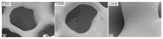 SEM micrographs of uncoated and PGSuc-coated bioactive glass 1393 scaffolds at high magnification (×500). The right micrograph of 1393P is at higher magnification (×2000) and shows surface resembling fabric or film, smoothly covering the scaffold’s struts, with a few areas of minor cracking.