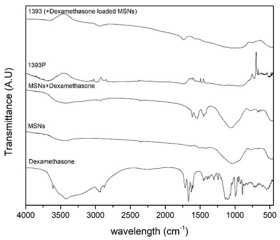 FTIR spectra of dexamethasone, MSNs, loaded MSNs, coated MSNs, and coated and drug-loaded samples.