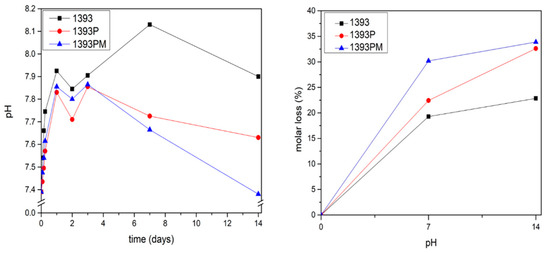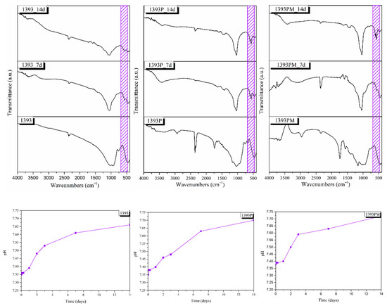The scaffolds were maintained in an incubator (Incucell 55, BMT Medical Technology, Zábrdovice, Czech Republic) at 37 °C. The solution was replaced at 6 h, 1 day after initial immersion, and then, every 2 days. The scaffolds were collected after 7 and 14 days of immersion, dried at room temperature and investigated using FTIR and SEM (JEOL JSM-7610F Plus, JEOL Ltd., Tokyo, Japan). The pH value was also recorded during the study.