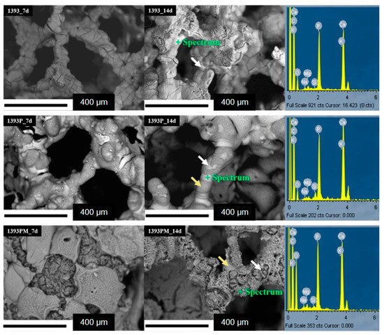 SEM micrographs and EDS spectra of 1393 bioactive glass (1393), PGSuc-coated 1393 bioactive glass (1393P) and MSNs with DexSP-loaded and PGSuc-coated 1393 bioactive glass scaffolds (1393PM corresponding to 1393PM 15%).