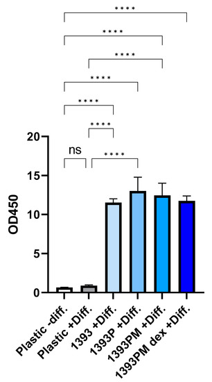 To better characterize our scaffolds, we evaluated their possible osteogenic differentiation properties by performing three-dimensional (3D) cultures of hAMSCs in contact with the experimental scaffolds for 21 days, with or without cell-differentiation medium (depending on the experiment). As reported, when hAMSCs are cultivated in cell-differentiation medium containing vitamins D3 and C, and bone morphogenetic protein-2 (BMP)-2, they transform into osteoblast-like cells within 2 to 4 weeks [64]. Routinely used techniques to assess osteogenic differentiation potential of a scaffold/material include the quantification of ALP activity and ARS staining. ALP activity usually serves as a marker of osteogenic differentiation in the early stages of stem cells’ osteogenic commitment as it progressively decreases when committed osteogenic cells further differentiate towards osteoblast-like cells. Our data provide preliminary evidence that the 1393PM scaffolds at 3 days of culture present the greatest performance upon ALP activity assessment among the scaffolds and compared to the + Diff. control (Figure S1). A gradual decrease in ALP was also observed, in agreement with literature. In the later stages of osteoblast differentiation, cells deposit calcium phosphate into the extracellular matrix, which was visualized using alizarin red staining. The highest increase in ALP activity in the supernatant was detected in the 1393P and 1393PM experimental groups in cell differentiation medium, while the most intensive alizarin red staining was also detected in these groups. We suppose that controllable degradation of the polymer coating during 21 days of observation promoted the slow and sustainable release of Si, Ca, Mg and other ions from the underlying ceramic material, without a dramatic increase in pH; this promoted hAMSC ALP activity and gradual matrix mineralization.