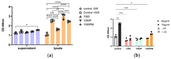 Once the samples (cell lysates or supernatant) were placed, an alkaline buffer solution of 1.5 M 2-amino-2-methyl-1-propanol (pH 10.3) was added at 20 μL/well. Afterwards, a substrate solution, prepared by dissolving 100 mg of 4-nitrophenyl phosphate disodium salt hexahydrate in 25 mL of ddH2O, was added at 100 μL/ well and incubated for 1 h at 37 °C. The amount of released p-nitrophenylphosphate was estimated by measuring the absorbance at 405 nm using the spectrophotometric method.