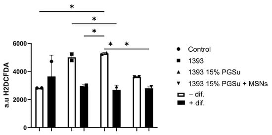 Upon implantation, artificial bone scaffolds can cause oxidant species formation because of the constant oxidative attacks by immune cells or through their degradation products [75]. The production of oxidant species (such as ROS, RNS and LPO) can eventually lead to oxidative stress, when the threshold antioxidant capacity of the surrounding tissues is surpassed [76]. At low levels, intracellular ROS may activate normal cellular processes in hAMSCs and their regenerative potential, while high levels of ROS can cause cellular apoptosis or death [77]. As reported, adipose-derived stem cells are resistant to oxidative stress, and may protect neighboring mature cells from oxidative damage by producing bioactive antioxidant factors (IGF-binding proteins, G-CSF platelet-derived growth factor, superoxide dismutase and HGF) [77]. Our study revealed that ADSTs in contact with scaffold materials generated lower or similar amounts of ROS compared to the control in cell differentiation medium. However, the lowest ROS amount was recorded for the 1393 15% PGSu + MSN scaffold. This may be explained by the ROS consumption by cells during their intensive differentiation. Another finding was statistically significant higher ROS production by cells in contact with experimental scaffolds in plain culture medium compared to cells alone. Such differences can be attributed to the presence of L-ascorbic acid 2-phosphate in cell-differentiation medium, which has strong antioxidant activity.