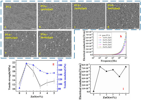 The performance of PVA/ZnO membrane in different mass fractions: (a–f) the surface of the membrane by SEM; (g) the tensile strength and modulus of membrane; (h,i) the conductive property of membrane in different frequencies.