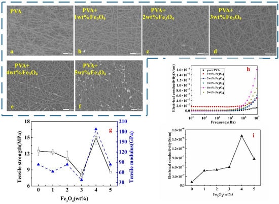 The performance of PVA/Fe3O4 membrane in different mass fractions: (a–f) the surface of the membrane by SEM; (g) the tensile strength and modulus of membrane; (h,i) the conductive property of membrane in different frequencies.