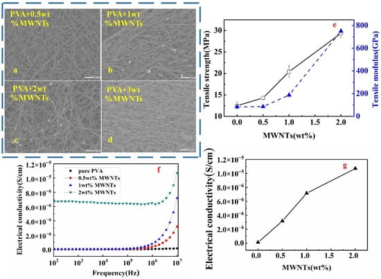 Figure 3f shows that electrical conductivities of PVA/MWNTs monolayer nanofibre membranes with different MWNTs mass fractions at different frequencies (102 to 107 HZ). Similar to PVA/ZnO and PVA/Fe3O4 monolayer membranes as showed in Figure 1h and Figure 2h respectively, the conductivity of PVA/MWNTs as displayed in Figure 3f exponentially increased at approximately 106 Hz until 107 Hz. The continuous increasing trend with the increase wt.% of MWNTs is portrayed in Figure 3g. The higher content of MWNTs, allows further individual conductive nano-granules; thus, the conducting bridged structure is easier to form, which has been advantageous to the conductivity of the membrane [16]. The continuous network made by individual carbon nanotubes will act as a conductive path for electrons and make the membrane electrically conductive [31]. The conductive property at 2 wt.% MWNTs membrane has a comprehensive improvement even in low frequency (6.0 × 10−6). The PVA membrane obtained conductive property at 2 wt.% MWNTs due to the conductive nature of carbon nanotubes also contributed to a decrease in internal resistance [32]. Finally, considering mechanical and conductive properties, the optimum spinning mass fractions of electroconductive fillers of ZnO, Fe3O4, and MWNT in films were 1, 4, and 2 wt.%, respectively.